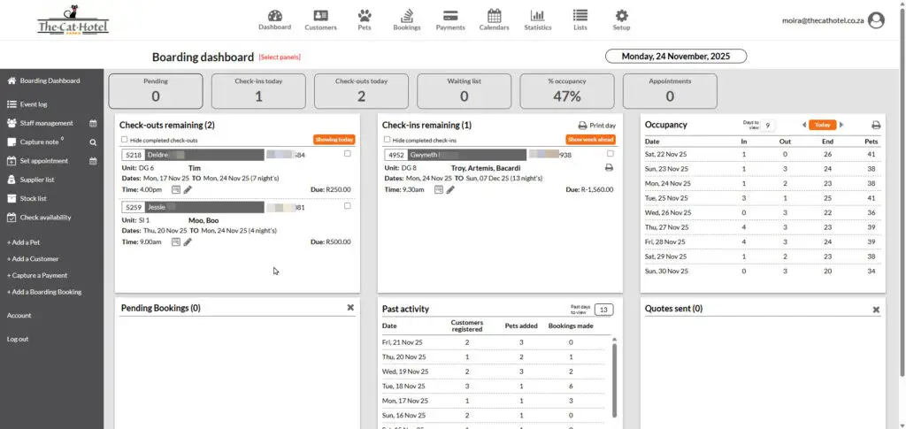 The Petwyse dashboard, running The Linden Cat Hotel seamlessly